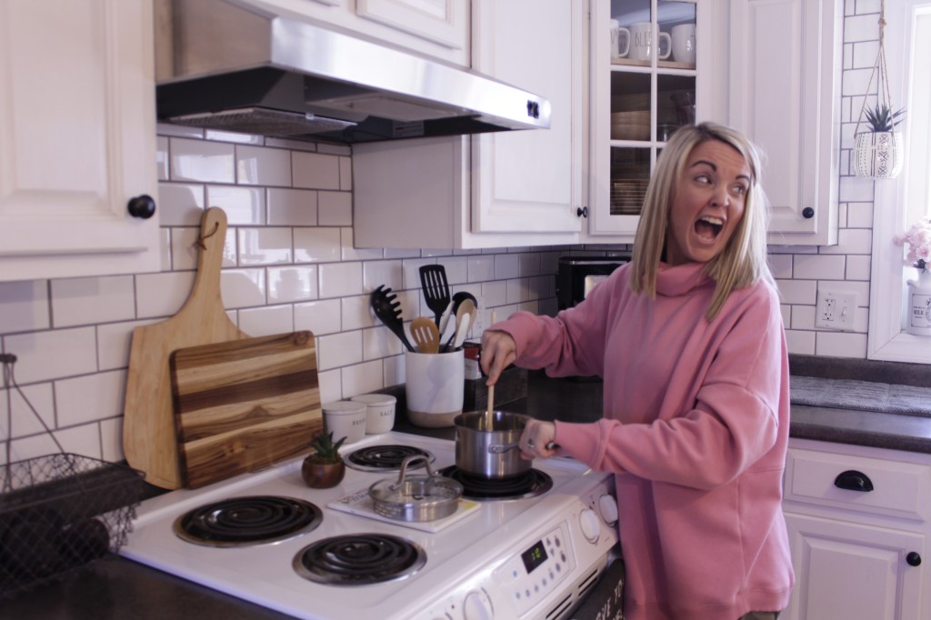 Cooking dinner while her husband is getting home from work and kids are running around often causes stress.