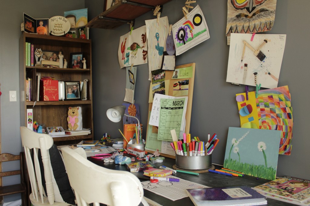 In her home she displays the artwork of her children.
