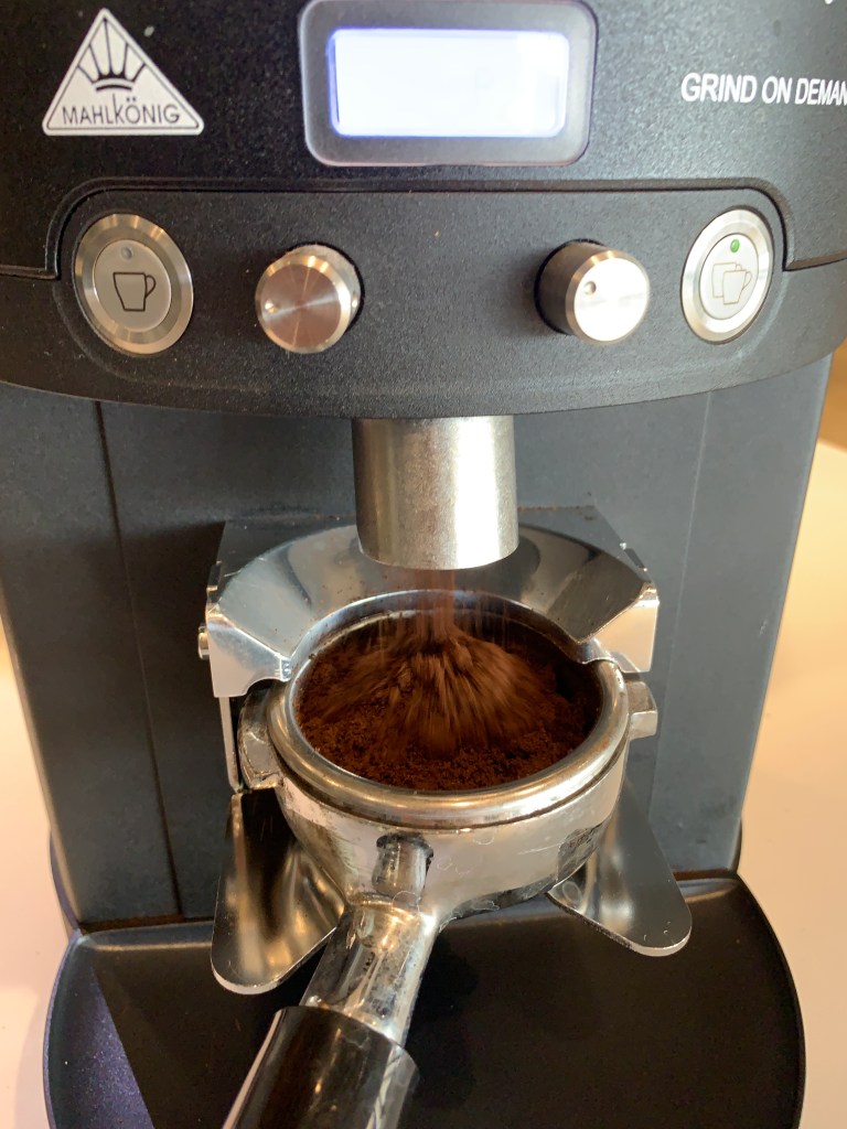This is an image of a coffee grinder grinding beans. The falling grounds caught in action gives this photo a lot of movement. If taken on a camera I would set the aperture that way only the grounds were in focus.