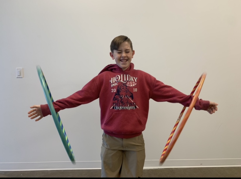 This image is of a boy spinning hula hoops around his arms. The timing of this photo worked well with the movement of the hula hoops.