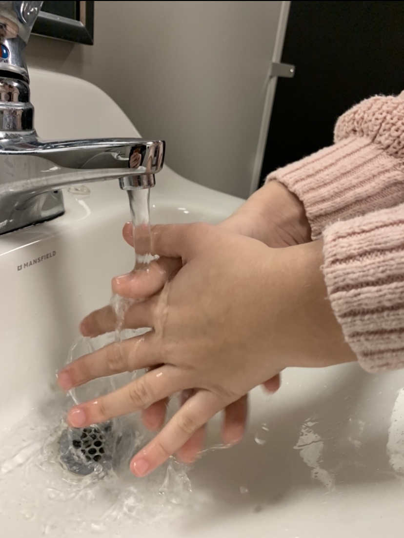 This is a photo of hands under running water. If using a camera I could have changed the aperture to make the background less clear and the water the only object in focus.