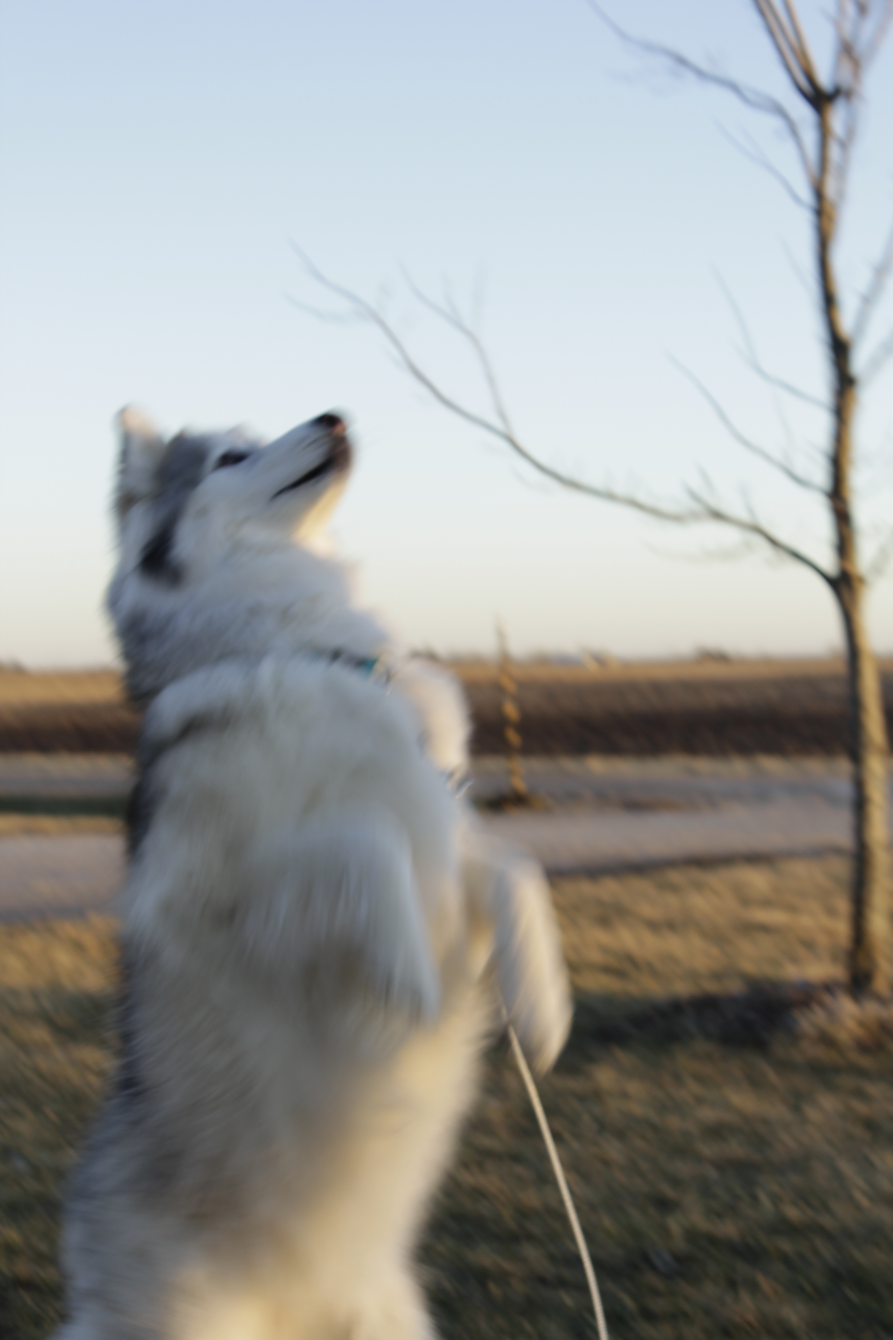 This is an image of a dog jumping vertically. Using a tripod could have created a more clean photo with the dog in motion and the background sharper.